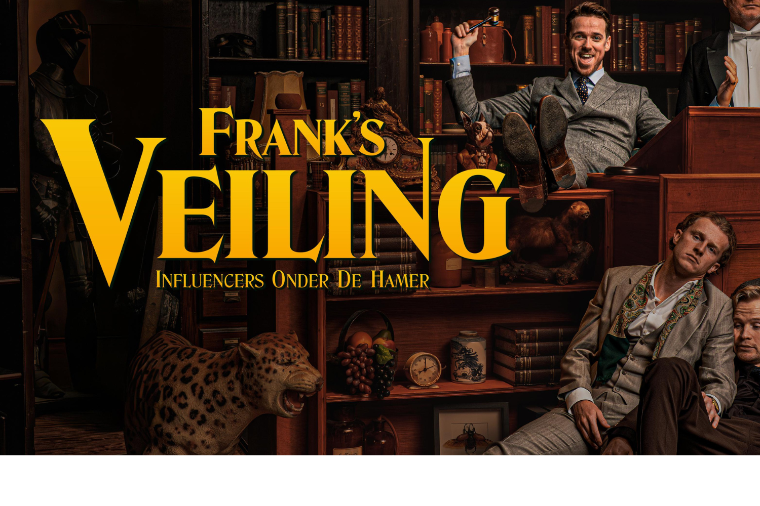 In Frank’s Veiling verwelkomt Frank een gezelschap van influencers in zijn omgekeerde veiling. In naam van zijn mysterieuze overgrootoom, de baron, veilt hij lachwekkende en genadeloze opdrachten. In deze veiling geven de deelnemers geen geld uit, maar maken ze juist kans om flink te cashen. Wie gaat het verst? Wie biedt het laagst? En wie verlaat de veiling met de meeste poen op zak? Vanaf 9 februari te zien op Prime Video.